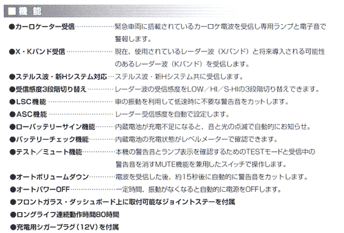 | パトカー等緊急車両に装備されたGPS受信機より算出した位置データを 無線で定期的(約15〜30秒間隔で)に警察本部に送る電波を受信して 緊急車両の接近を警告します。 データ送信のため、会話が聞けるわけではありません。 ※間欠電波のため接近してから警報する場合もあります。 ※カーロケーターシステムは導入されていない地域や搭載していない車両 もあるのですべての緊急車両に反応するわけではありません。 |