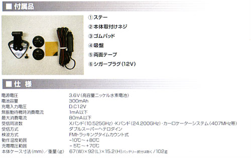 | Xバンドとは、現在行われているレーダー式取り締まり機の周波数です。 ステルス式やHシステムにも使用されています。 Kバンドとは、海外のスピード取締りに使用されている周波数です。日本 国内では現在はまだ使用されていませんが、将来的に導入される可能性 を想定し、Kバンドの周波数にも対応しております。 |